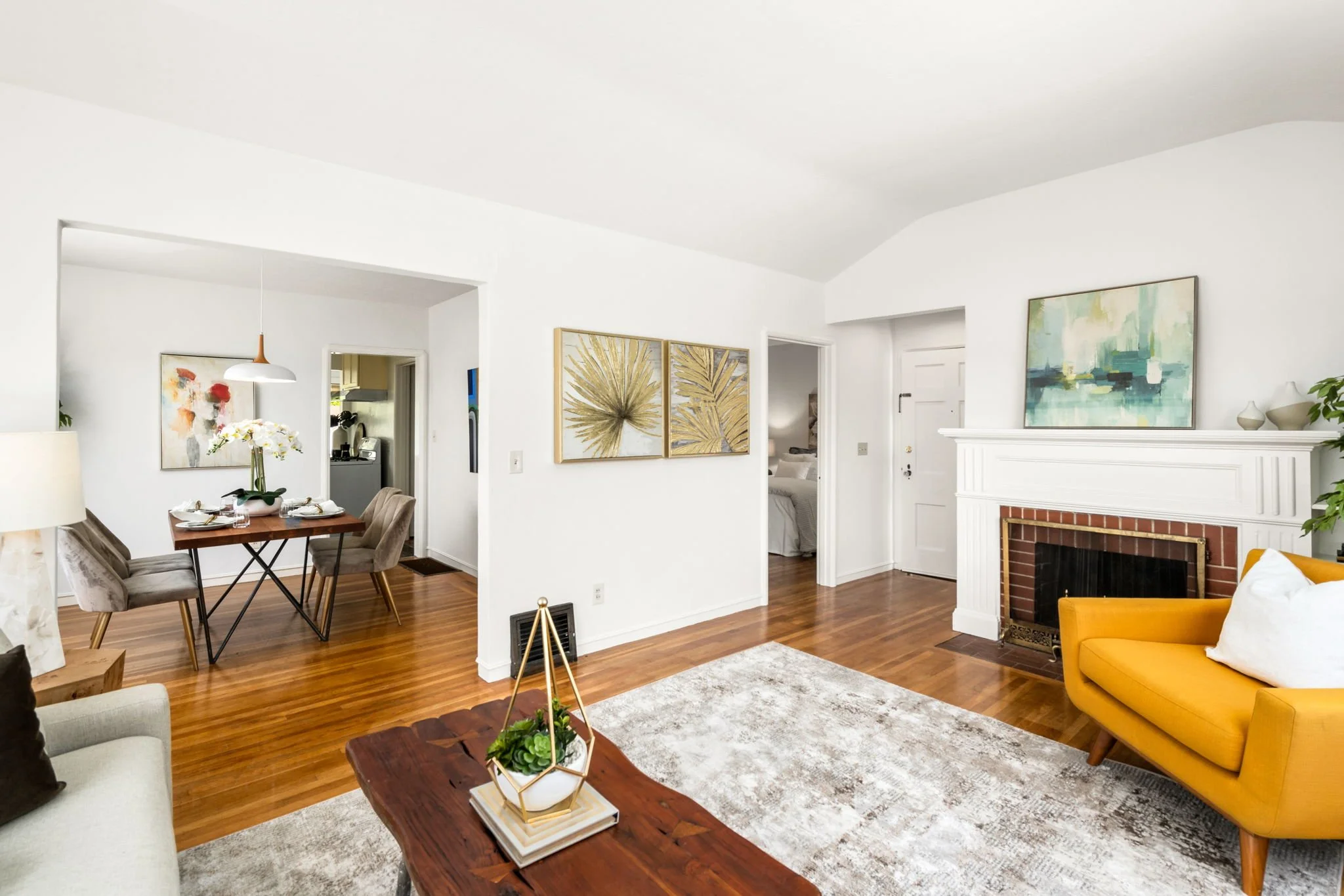 The living room is bright and airy with a gorgeous period fireplace, large picture windows, and original period hardwood floors. The formal dining room flows into a vintage kitchen with well-preserved tilework, a farmhouse sink, and a sunny nook that opens to a private deck overlooking the expansive backyard.