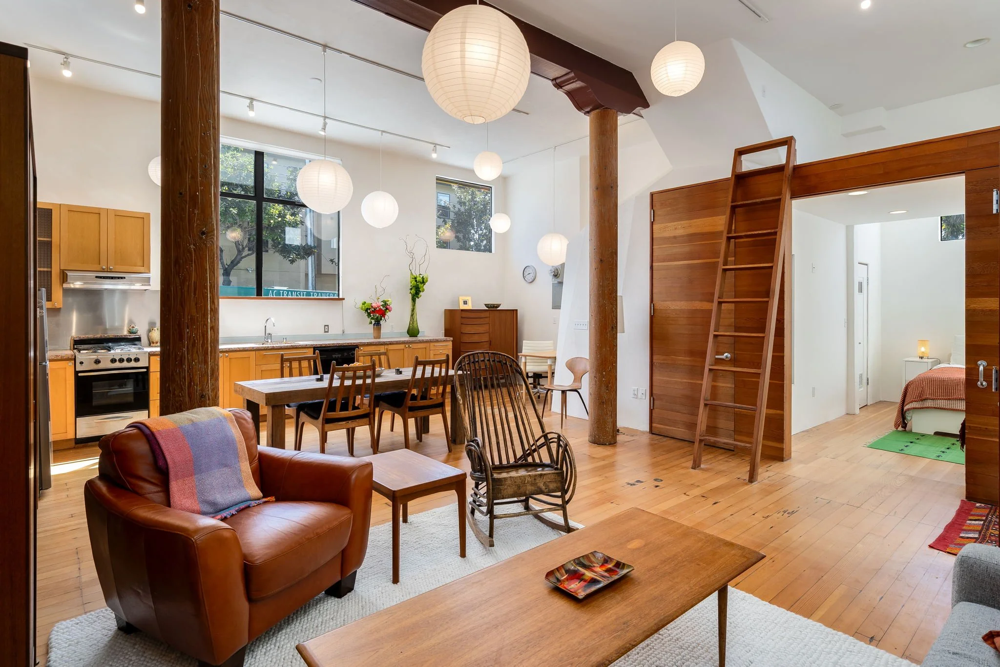 In-unit laundry and a flexible layout make the space as functional as it is beautiful. In the evening, curated orb lighting adds warmth and ambiance, enhancing the richness of the preserved wood details.